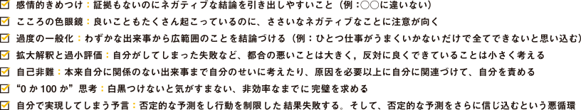 多くの人が共通して持っているものですが、うつ状態だと特に顕著になりがちです。負のサイクルに入らないように要注意。