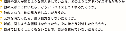 バランスのとれた思考を導き出すために、視点を変えて考えてみましょう。下記のように様々な角度から自分に問いかけることで、ものごとを新しい角度で捉えなおすことができます。
